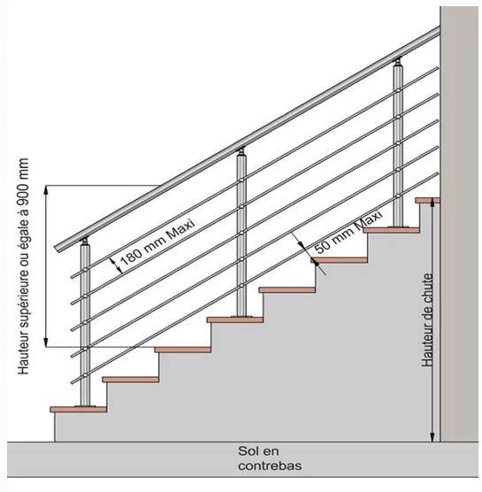 Hauteur minimale : Un garde-corps doit mesurer au moins 1 mètre de haut (90 cm pour une rampe d’escalier).